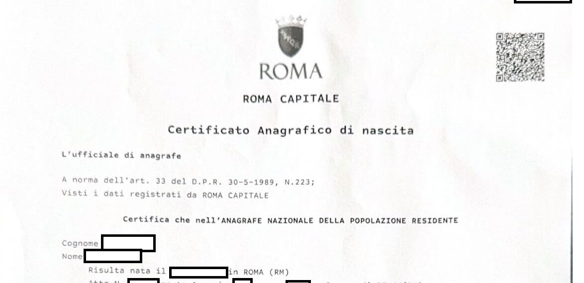 Certificato di nascita: einfache Bescheinigung mit grundlegenden Daten (Name, Geburtsort, Datum).